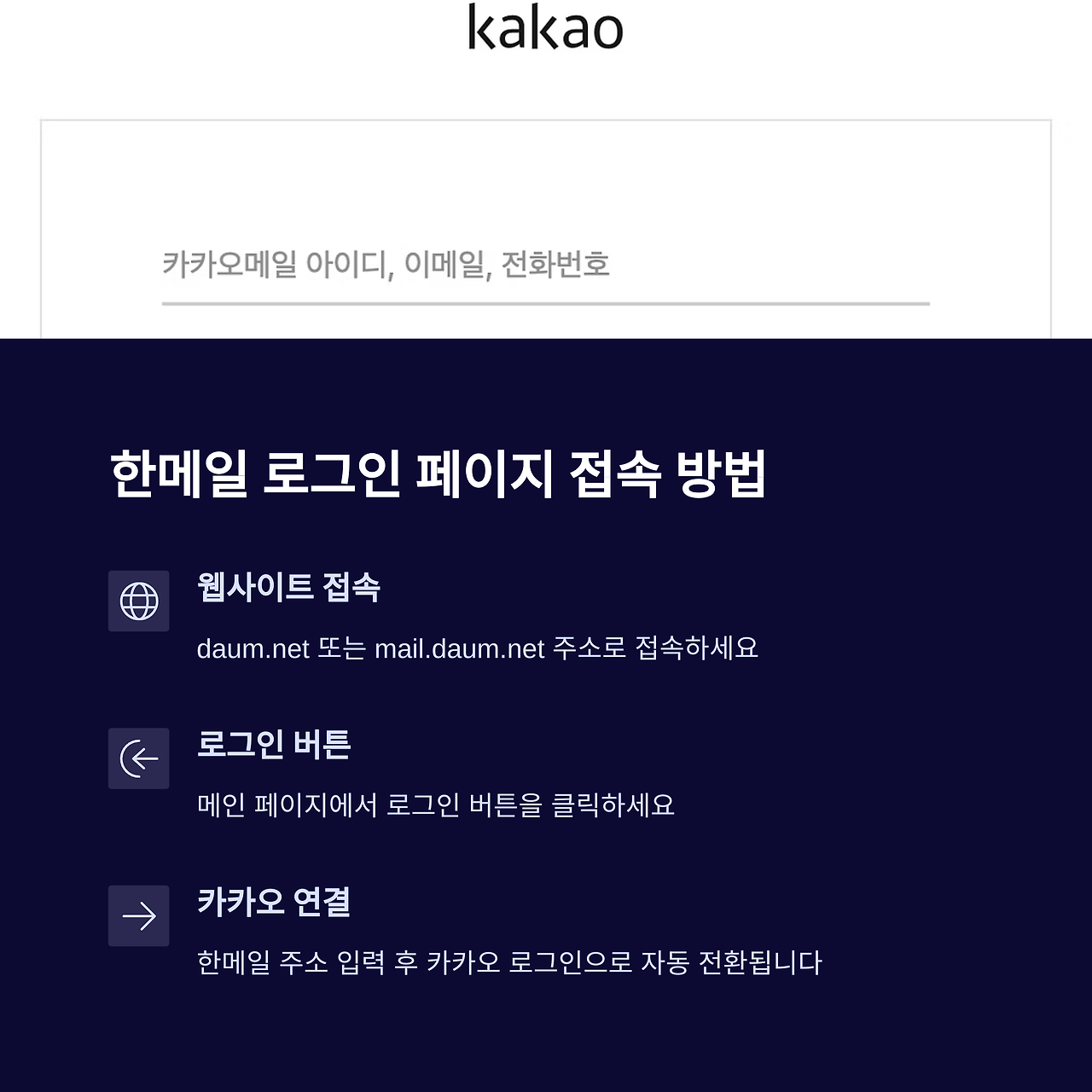 한메일은 카카오와 통합되어 카카오 계정으로도 로그인할 수 있는 점이 특징입니다.