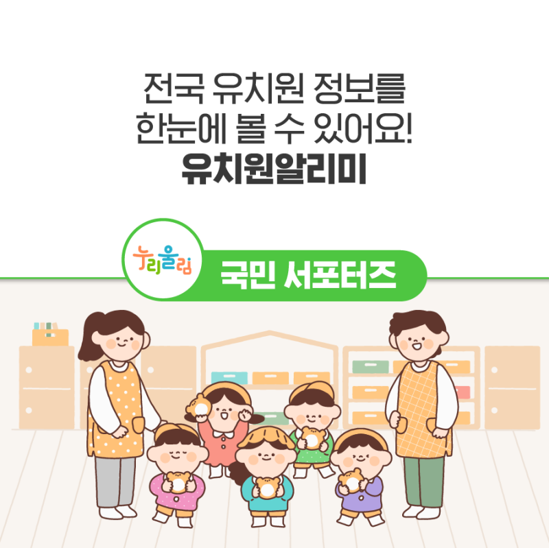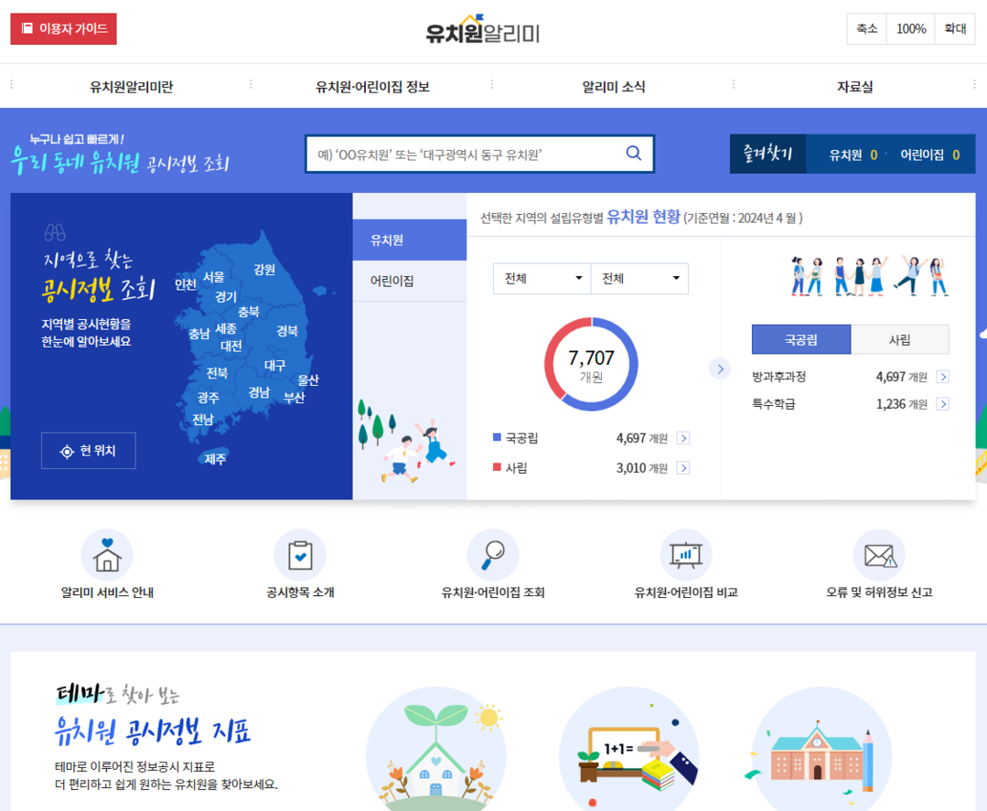 - 유치원 검색 : 사용자는 지역별, 유형별로 유치원을 검색할 수 있습니다. 현재 7,707개의 유치원이 등록되어 있습니다.