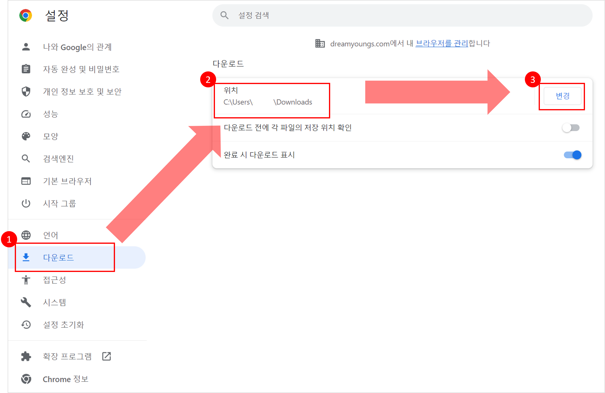 - 다운로드 위치 설정 : 크롬의 설정 메뉴에서 다운로드 위치를 변경할 수 있습니다. 기본적으로는 "C:\Users\Downloads"로 설정되어 있습니다.